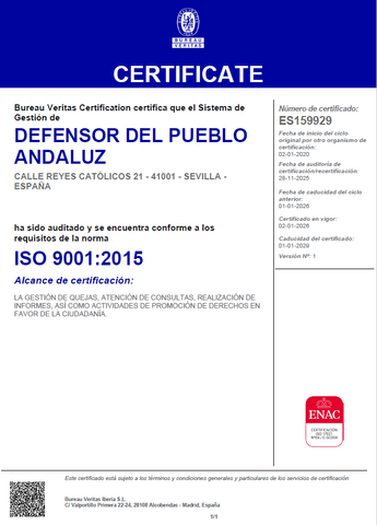 La entidad Bureau Veritas Certification ha certificado que el Defensor de Pueblo Andaluz dispone de un sistema de gestión de la calidad conforme a la norma UE- EN ISO 9001:2015 para las actividades de gestión de quejas, atención de consultas, realización de informes y actividades de promoción de derechos en favor de la ciudadanía.