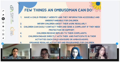 Se informa que los defensores de los niños trabajan con organizaciones y proyectos como Child rights connect us y recopilan información del funcionamiento de estos. Nos explicaron que ya habían preguntado a nuestros gobiernos sobre las preguntas que iban a hacernos, pero que también querían contar con la opinión de la infancia.