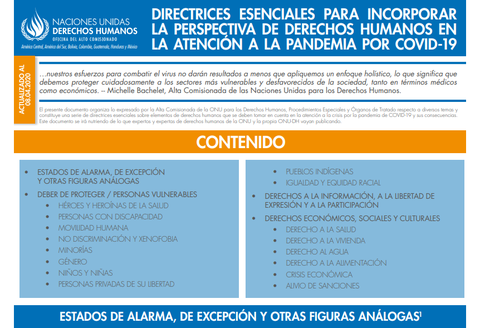 El presente documento organiza lo expresado por la Alta Comisionada de la ONU para los Derechos Humanos, Procedimientos Especiales y Órganos de Tratado respecto a diversos temas y constituye una serie de directrices esenciales sobre elementos de derechos humanos que se deben tomar en cuenta en la atención a la crisis por la pandemia de COVID-19 y sus consecuencias. Este documento se irá nutriendo de lo que expertos y expertas de derechos humanos de la ONU y la propia ONU-DH vayan publicando.