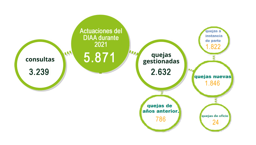 Fueron 5.871 actuaciones por parte de este comisionado, de las cuales 2.632 se refieren a quejas y 3.239 a consultas. En asuntos de infancia, adolescencia y juventud se tramitaron un total de 1,846 expedientes de queja nuevos, de los cuales 1.822 fueron instados por la ciudadanía y 24 se iniciaron de oficio promovidos por la Institución. Junto con estas actuaciones se realizaron otras 786 más, procedentes de quejas iniciadas en años anteriores.