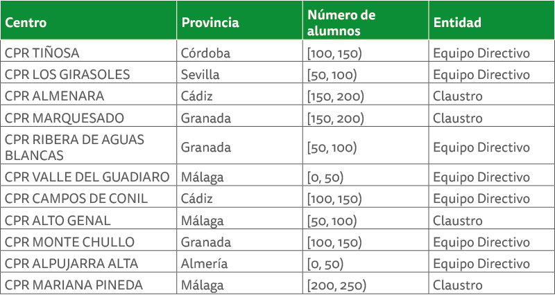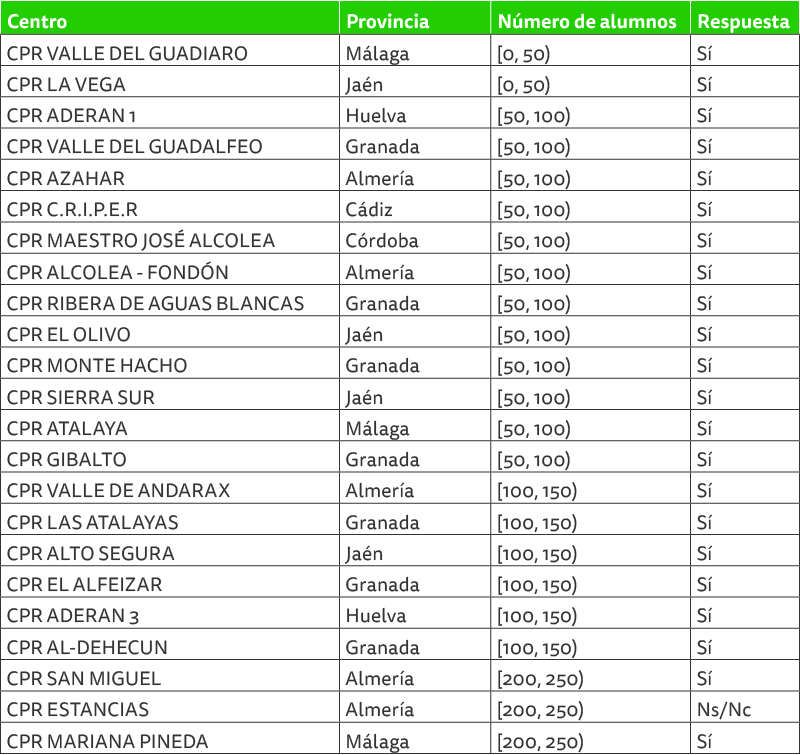 No obstante, hemos de lamentar que esta colaboración ha tenido dos excepciones. Así, no han prestado su apoyo las personas que venían ejerciendo funciones de dirección de dos colegios públicos rurales: CPR “Alto Almanzora” en Armuña de Almanzora (Almería) y CPR “Medio Almanzora” en Albox (Almería). A pesar de los múltiples requerimientos realizados, en la última conversación telefónica mantenida con estas dos personas confirmaron su intención de no cumplimentar los datos de la encuesta y así lo manifestarían a la Inspección de educación. Además de un incumplimiento legal por parte de estas funcionarias en las labores de colaboración y auxilio preferente a las labores de la Defensoría, su infundada negativa condiciona en cierta medida el análisis estadístico que se realiza en el capítulo 6 al no haberse podido incluir la información que afecta a ambos centros docentes y sus respectivas sedes.