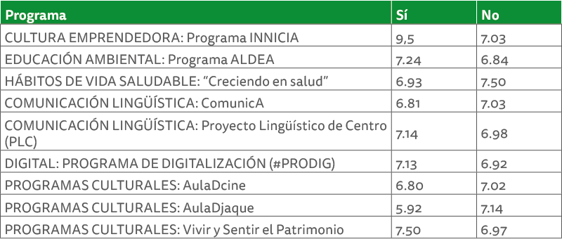 En caso de haber respondido sí en alguna de las cuestiones anteriores, valore la experiencia del centro sobre su participación en esos planes o programas.