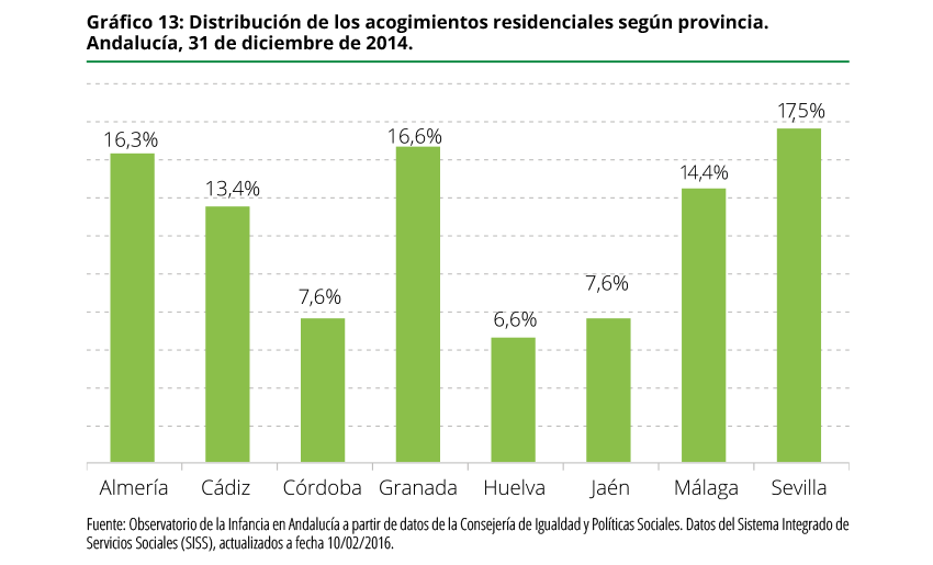 En cuanto a los menores en el Sistema de Protección, a finales de 2014 la Junta de Andalucía tenía asumida la tutela de 5.684 menores de edad, 35 de cada 10.000 personas menores de 18 años de la Comunidad Autónoma estaban bajo la tutela de la Administración Pública. A 31 de diciembre de 2014 el Sistema de Protección registraba 2.166 chicos y chicas en acogimiento residencial y 2.882 en acogimiento familiar. El 37,4% de las personas menores de 18 años en acogimiento residencial eran niñas o chicas y el 62,6% niños o chicos. En cuanto a las adopciones, durante 2014 se registraron 319 nuevas solicitudes de adopción nacional, se emitieron 159 certificados de valoración de idoneidad (139 se consideraron idóneos y 20 no idóneos) y se produjeron 125 Autos de adopción nacional.