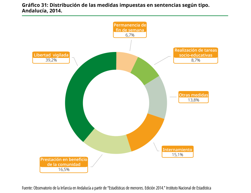 Un 83,1% de las medidas impuestas en sentencia estaban destinadas a chicos, siendo las más frecuentes: libertad vigilada (39,7%), prestación en beneficio a la comunidad (16,4%) e internamiento (16%). Entre las chicas, las medidas más adoptadas también fueron la libertad vigilada (36,7%), prestación en beneficio a la comunidad (17,2%) y otras medidas (17,2%).