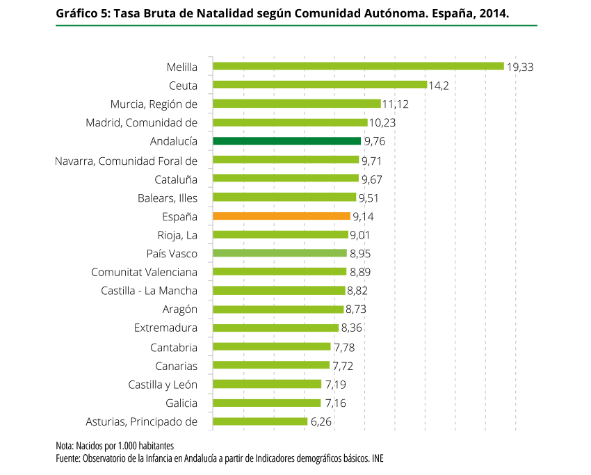 En Andalucía, en 2014, la tasa bruta de natalidad registró 9,76 nacimientos por cada 1.000 habitantes, lo que ha supuesto un ascenso respecto al año anterior en el que se registró una tasa de 9,71 nacimientos, siendo este incremento una constante en los últimos años. La tasa registrada en Andalucía es superior a la media española, donde se registró una tasa de 9,14 nacimientos por cada 1.000 habitantes. Respecto a otras Comunidades, Andalucía se sitúa en la quinta posición como Comunidad con mayor tasa bruta de natalidad, junto a Madrid con una tasa de 10,23 o la Comunidad Foral de Navarra con una tasa de 9,71 nacimientos por cada 1.000 habitantes.